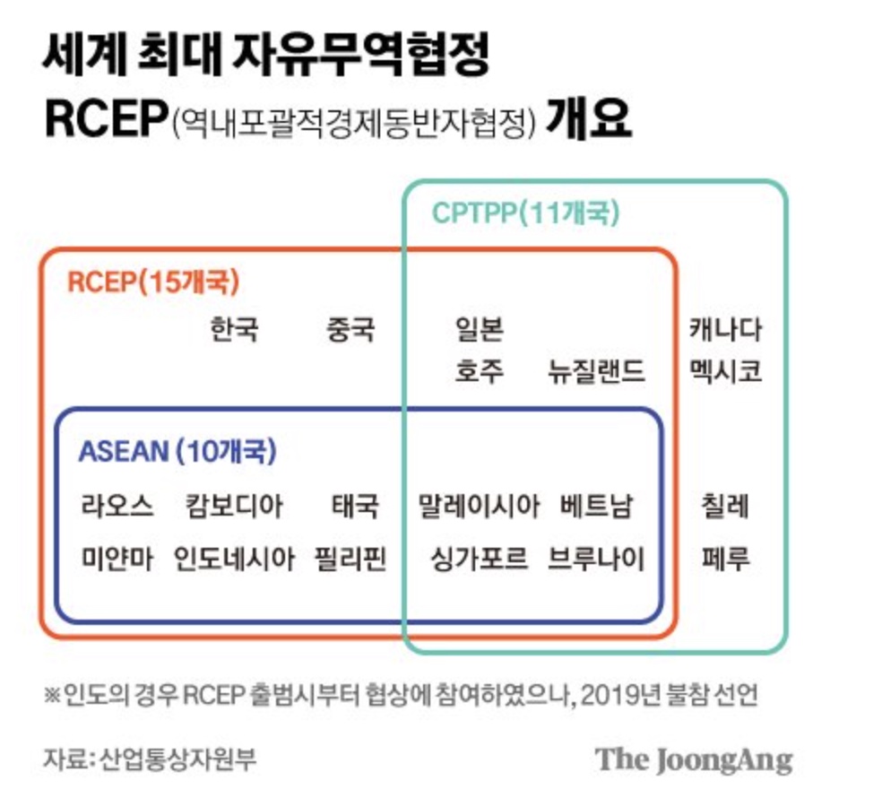 바로 '역내 포괄적 경제 동반자 협정(RCEP)'입니다. 2019년에 중국의 주로도 협정이 타결됐고 효력은 올해부터 시작됐습니다.