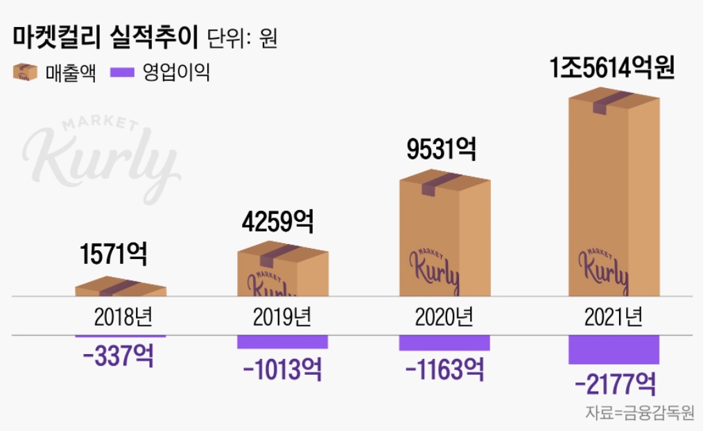 '새벽 배송'으로 온라인 유통업체의 강자로 등장한 '마켓 컬리'가 올해 국내 이커머스 1호 상장을 준비하고 있다고 합니다. 현재 한국거래소에 상장 예비심사를 청구해 놓은 상태라고 합니다. 조만간 등장할 새내기 기업에 증권사 애널리스트들도 큰 관심을 갖기 시작했다고 합니다. 감사 보고서에 따르면 '마켓컬리' 매출은 1조 5614억 원, 영업손실은 2177억 원으로 영업손실 2020년 1163억 원에서 87% 증가했다고 합니다. 거의 두 배 정도 늘어난 거라고 볼 수 있습니다.