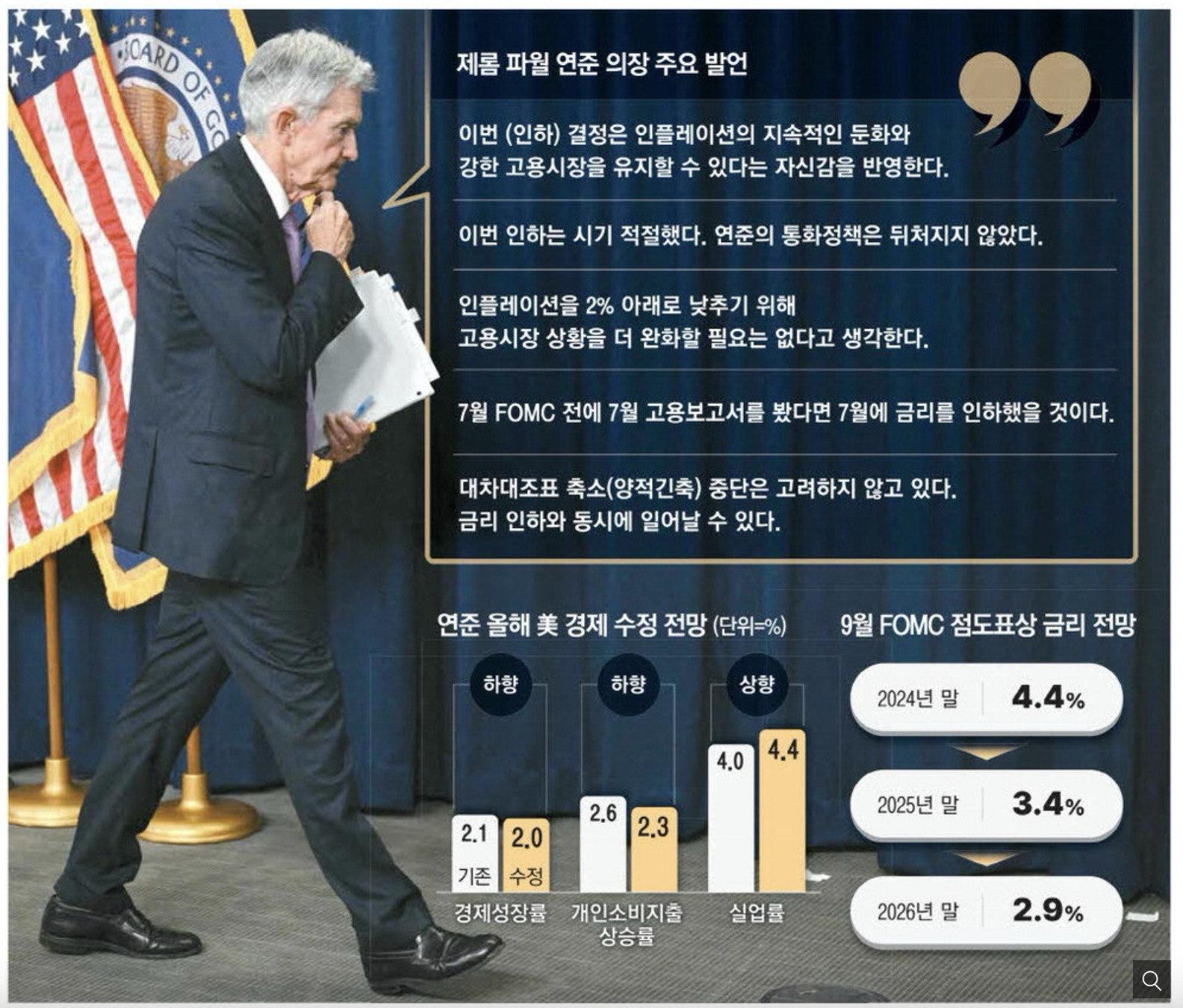 이제 시작된 기준금리 인하는 당분간은 이어질 것으로 보입니다. 연준에서 발표한 경제 전망 자료를 보면 올해 말까지 0.5% 포인트 정도 더 금리를 내릴 것으로 전망됩니다. 기준 금리를 정하는 FOMC는 오는 11월 12월에 열리는데 이 두 차례 회의를 통해서 차례로 0.25% 포인트씩 총 0.5% 포인트를 내릴 가능성이 더 클 것으로 봅니다.